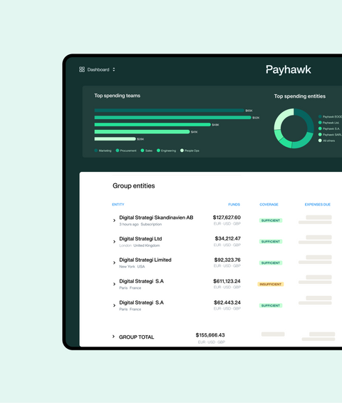 Bij Payhawk helpen we klanten om uitgavenbeheer voor meerdere entiteiten te stroomlijnen via één platform en naadloze koppelingen met ERP- en HRIS-systemen. Onze oplossing is geschikt voor zowel beursgenoteerde bedrijven als snelgroeiende MKB’s, actief in meer dan 32 landen. Van de VS tot het VK en de EER. Ook voor nationale operaties, zoals bij Wellpointe Inc., biedt dit schaalbaar voordeel.